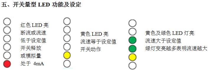 將流量開(kāi)關(guān)裝好,使介質(zhì)以需要監(jiān)測(cè)的流速流動(dòng),擰開(kāi)面板上的螺絲,調(diào)整電位計(jì), 使第一個(gè)綠色LED怡好變亮。此后當(dāng)流速低于當(dāng)前值時(shí),開(kāi)關(guān)就釋放(紅燈亮)。若要使開(kāi)關(guān)點(diǎn)比當(dāng)前流速小,可調(diào)整電位計(jì)(順時(shí)針旋轉(zhuǎn)螺絲刀)使綠色 LED多亮一些。