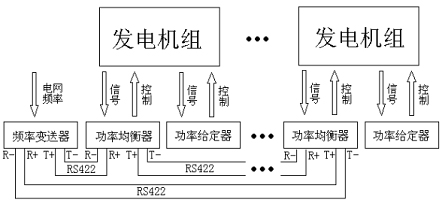 頻率變送器測(cè)量到電網(wǎng)頻率不在其設(shè)置的頻率上下限范圍內(nèi),如頻率低于下限,則向所有功率均衡器發(fā)送增速控制命令,功率均衡器按頻率變送器設(shè)置的繼電器吸合、釋放時(shí)間對(duì)本儀表的增速繼電器進(jìn)行動(dòng)作,調(diào)節(jié)電網(wǎng)頻率。如果高于上限,則發(fā)送減速控制命令。