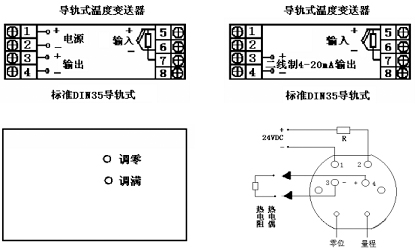 對導軌式溫度變送器輸入可以是熱電偶、熱電阻、標準信號。工作電源接端子1、2,4~20mA輸出信號接3正、4負;對二線制4~20mA輸入信號正接5、負接6;熱電阻單端A接5、并聯(lián)端B、C分別接6、7。