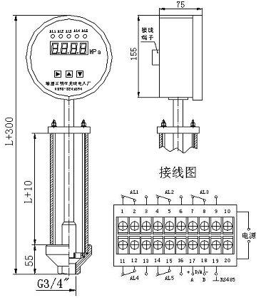 例:表示量程150mm,隔離膜片316L不銹鋼接口,數(shù)碼管LED顯示,2個接點輸出,G3/4鋁合金,帶4~20mA輸出,工作電源AC/DC220V。 |