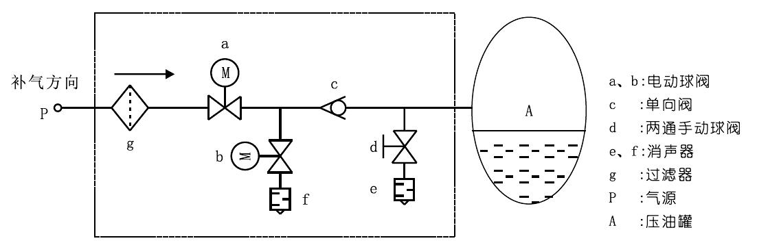 停止補(bǔ)氣:當(dāng)壓油灌A補(bǔ)滿時(shí),關(guān)閉電動(dòng)球閥a,停止補(bǔ)氣。打開電動(dòng)球閥b,壓油灌A的氣壓被單向閥c阻斷,a和c之間的管段被排空至常壓,單向閥密封增強(qiáng)。同時(shí),防止球閥a滲漏過補(bǔ)氣。